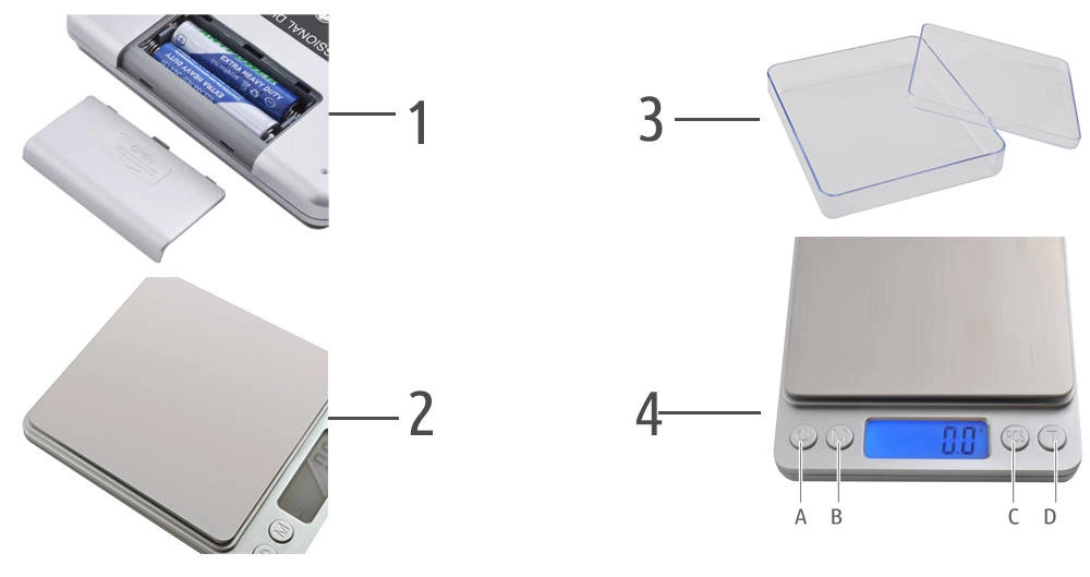 Waga posiada dwie pokrywki, które można wykorzystać zarówno jako ochronę wagi przed zabrudzeniem/zalaniem, jak również jako pojemniki na sypkie przedmioty do ważenia.
