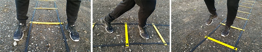2. Szybki skip, z nisko unoszonymi kolanami Przeskakuj na drabinkach unosząc kolana tylko tyle by wystarczyło na przeskok nad kolejnym szczebelkiem drabinki. Ważne jest jak najszybsze wykonanie tego ćwiczenia.