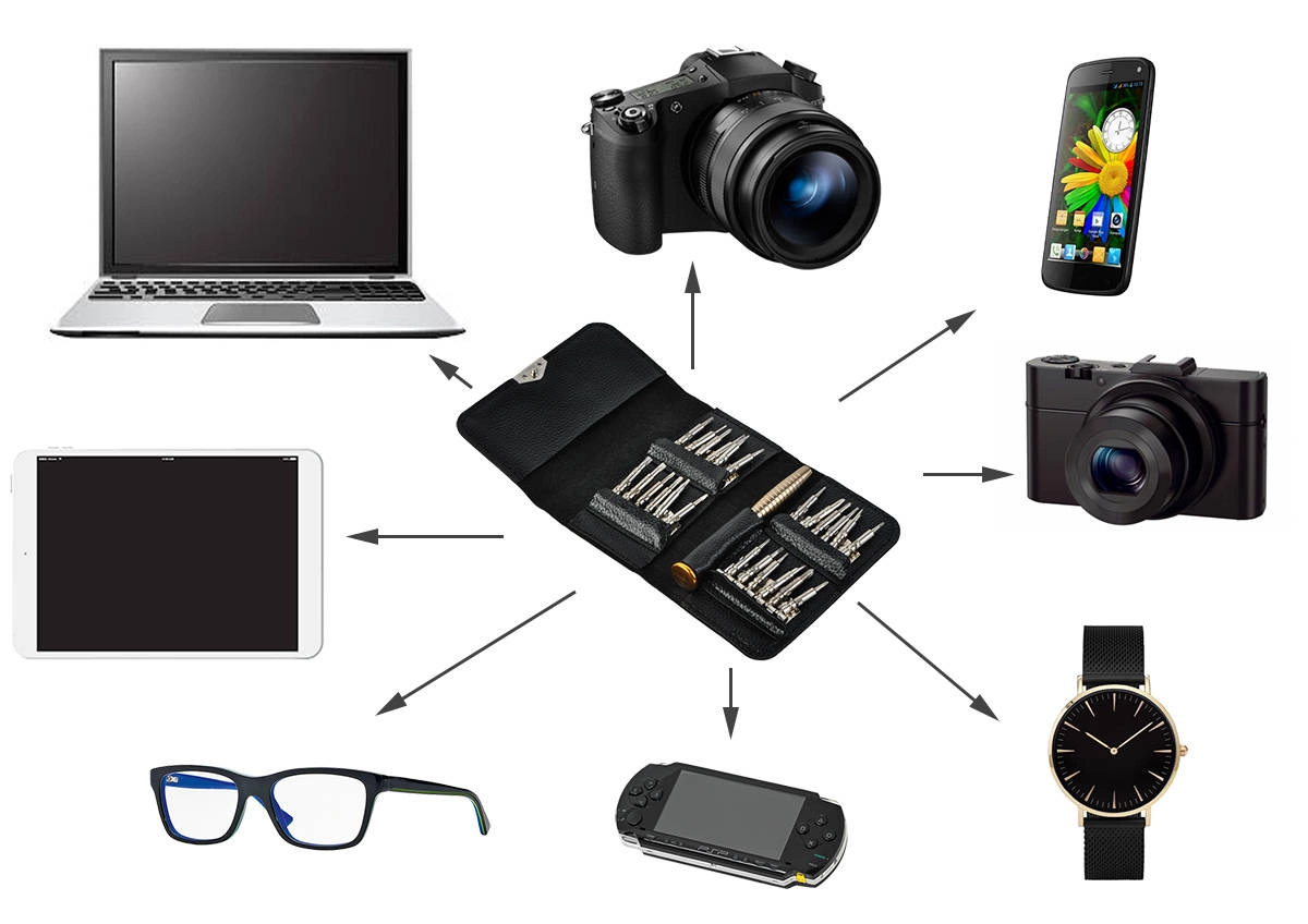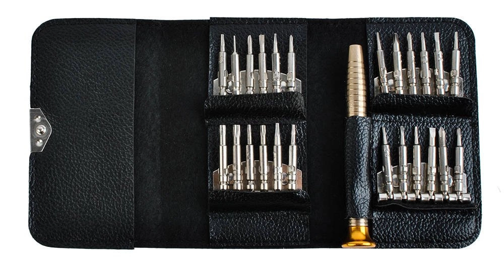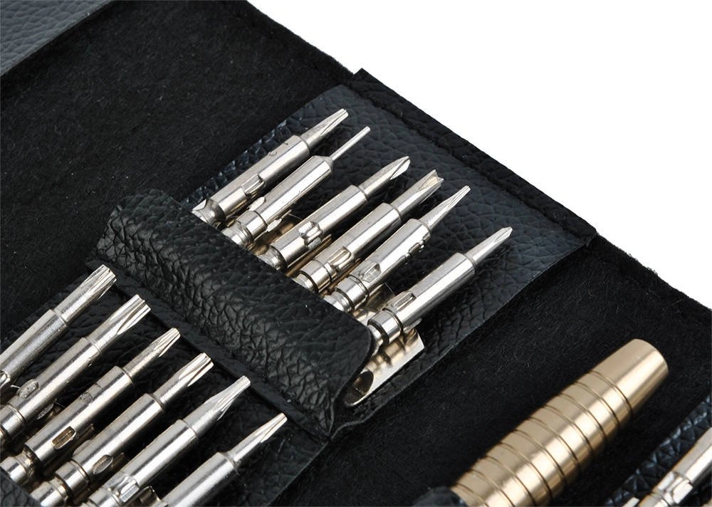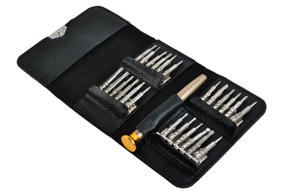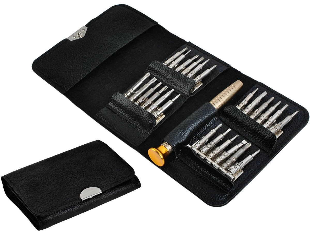 Naprawa nowoczesnych urządzeń elektronicznych wymaga nie tylko umiejętności, ale również wykorzystania odpowiedniego, precyzyjnego sprzętu. Producenci stosują różnego rodzaju zabezpieczenia, co sprawia, że do ich otwarcia wymagane są dodatkowe końcówki, które trudno znaleźć w podstawowych zestawach wkrętaków. Zestaw specjalistycznych wkrętaków to 25 elementów znajdujących się w etui zamykanym na magnes. Każdy element posiada swoje własne miejsce, co pozwala na zachowanie porządku oraz sprawną organizację miejsca pracy, a tym samym jej szybkie i dokładne wykonanie. Komplet przeznaczony jest zarówno do napraw telefonów, smartfonów i tabletów jak również wszystkich innych urządzeń i sprzętów, które posiadają niestandardowe, drobne śruby.