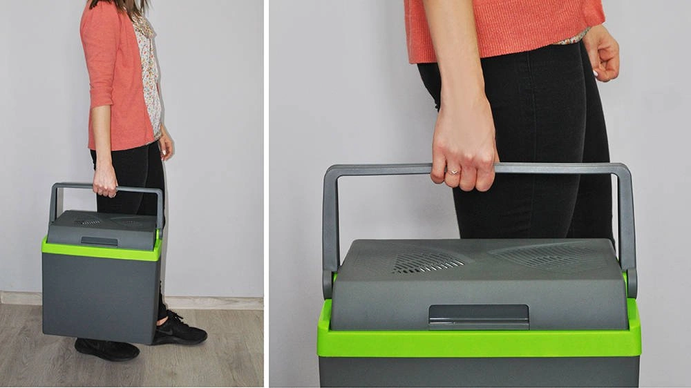 Lodówka samochodowa jest łatwa w utrzymaniu czystości. Pomieści bez problemu aż 4 butelki 1,5 l, ułożone pod odpowiednim kątem, a także kilka mniejszych butelek lub małych produktów żywnościowych. Lodówka z grzaniem posiada wygodną rączkę do przenoszenia, dzięki czemu jej transport np. z samochodu do domku na działce nie będzie problematyczny – nawet kiedy będzie wypełniona. Uchwyt, który posiada lodówka turystyczna posiada również dodatkowe funkcje – może być wykorzystany również jako podpora otwartej w lodówce klapy, a także jako blokada otwierania lodówki (np. przez dzieci).