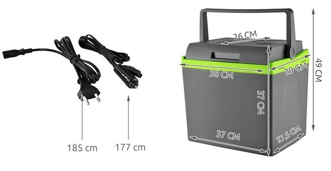 - SPECYFIKACJA – kolor: szary, pojemność: 28 l, zasilanie: DC 12V - chłodzenie 45W, grzanie 40W, zasilanie: AC 220-240V 50-60Hz - chłodzenie 55W, grzanie 50W, temperatura chłodzenia: 15-20 stopni poniżej temperatury otoczenia, temperatura grzania: 55-65 stopni, wymiary zewnętrzne (szer/wys/dł): 38/29/49 cm, długość kabla sieciowego: ~185 m, długość kabla do zapalniczki samochodowej: ~177 cm, waga lodówki: 4 kg, waga z opakowaniem: 4,75 kg, w zestawie: lodówka, kabel sieciowy, kabel do zapalniczki samochodowej.