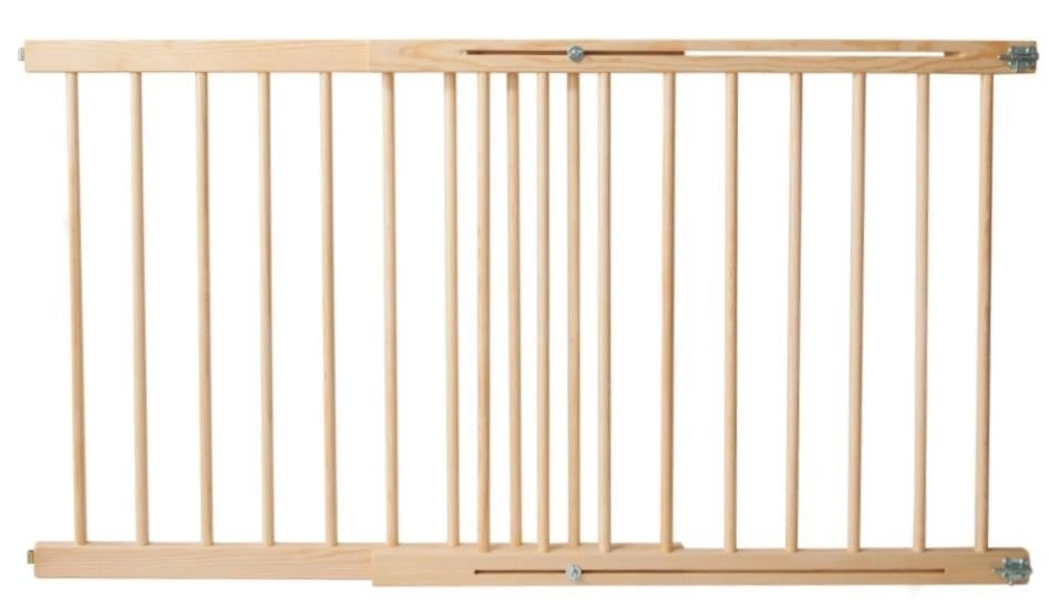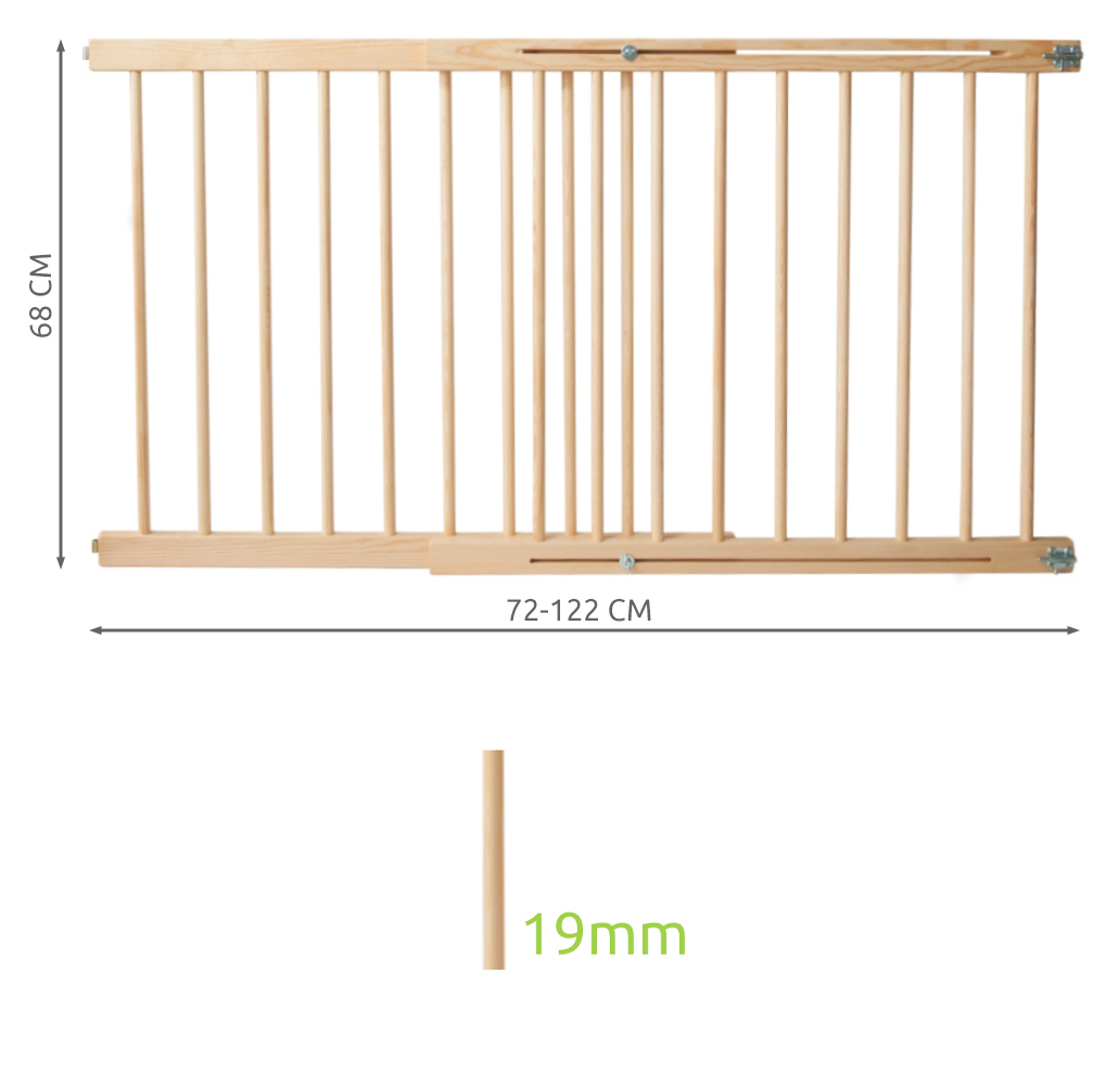 - SPECYFIKACJA – materiał: drewno – sosna, bramka pasuje do przejść o szerokości: 72-122cm; szerokość między szczebelkami: 7,5cm; wysokość bramki: 68cm; grubość szczebelka: 19mm; waga bramki: 3kg; waga z opakowaniem: 3,7kg.