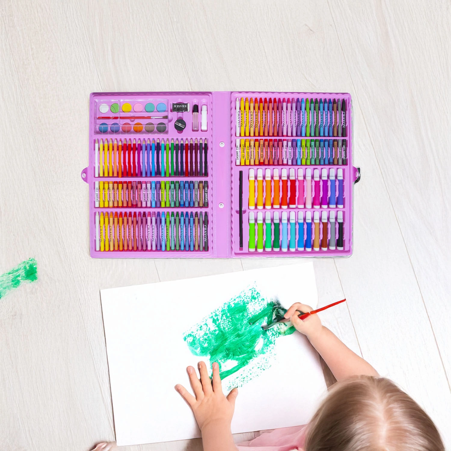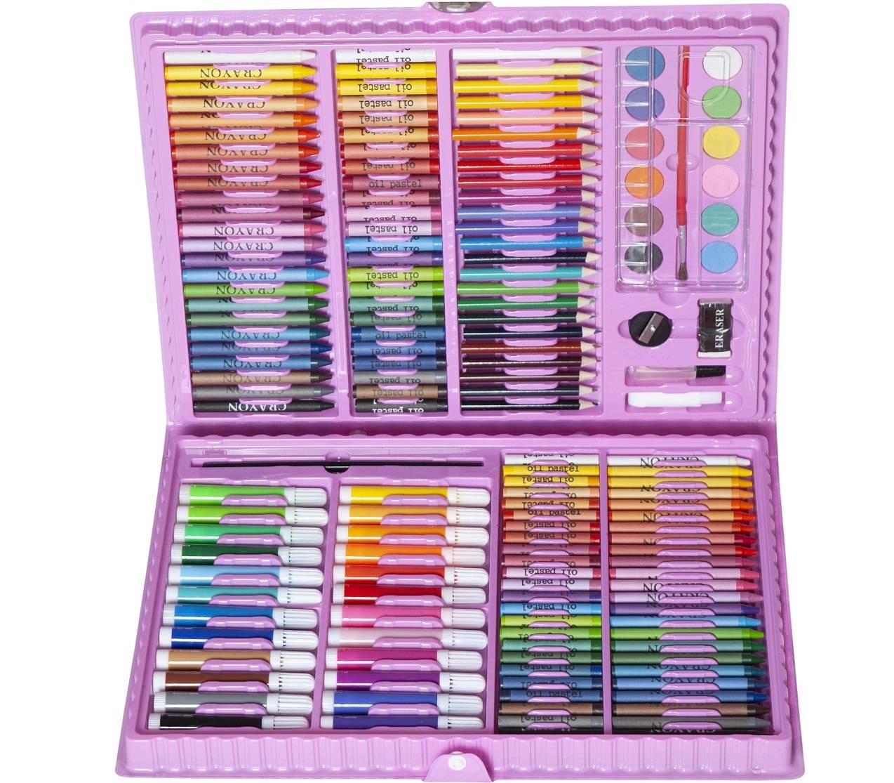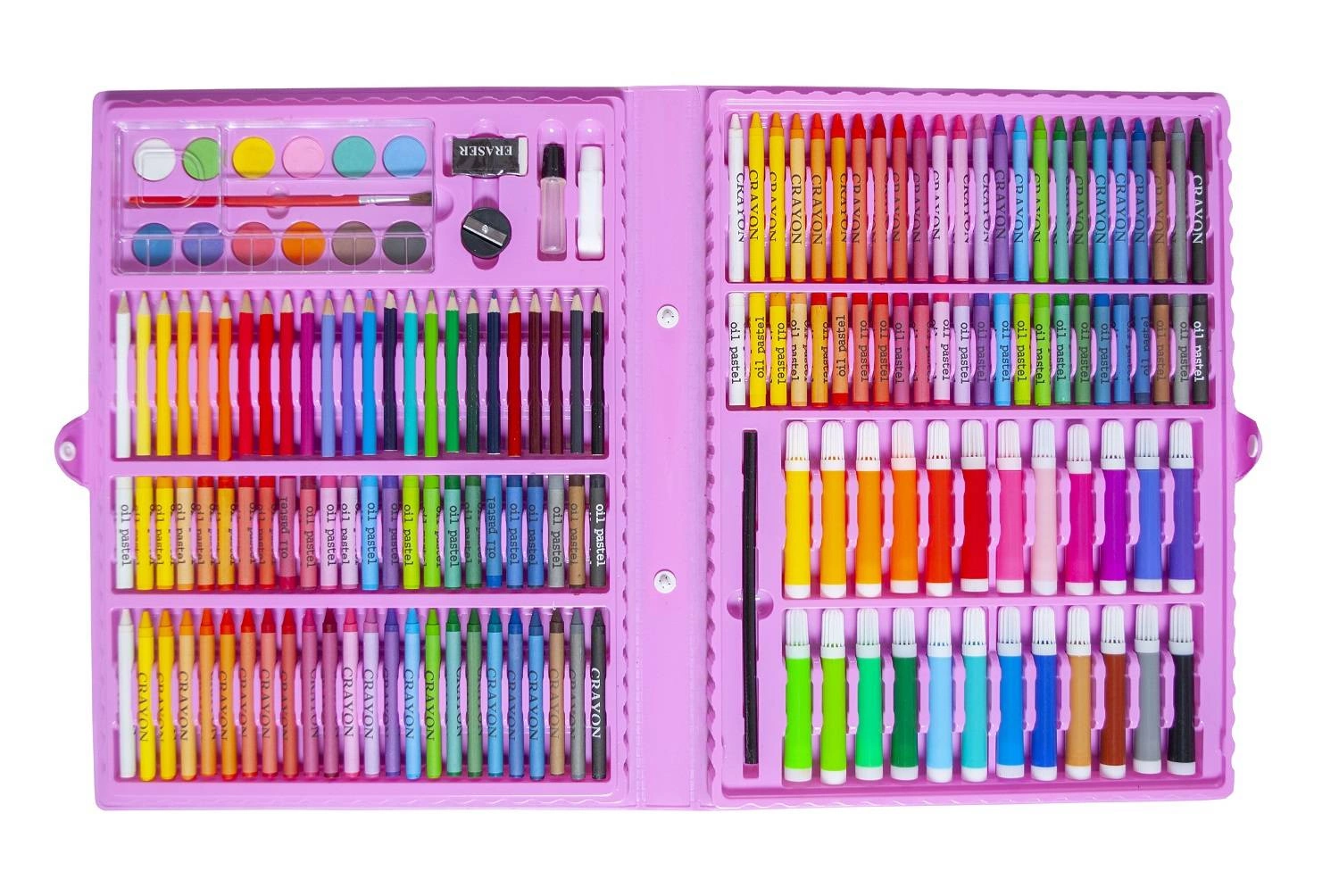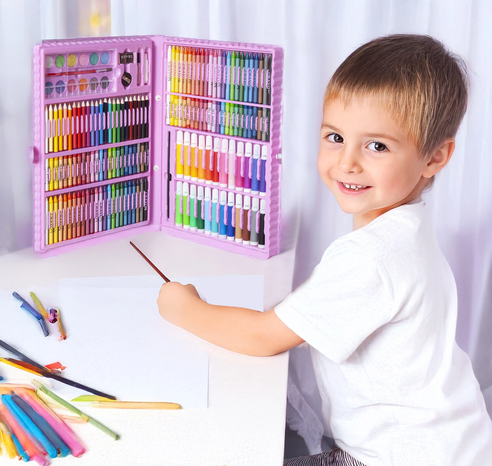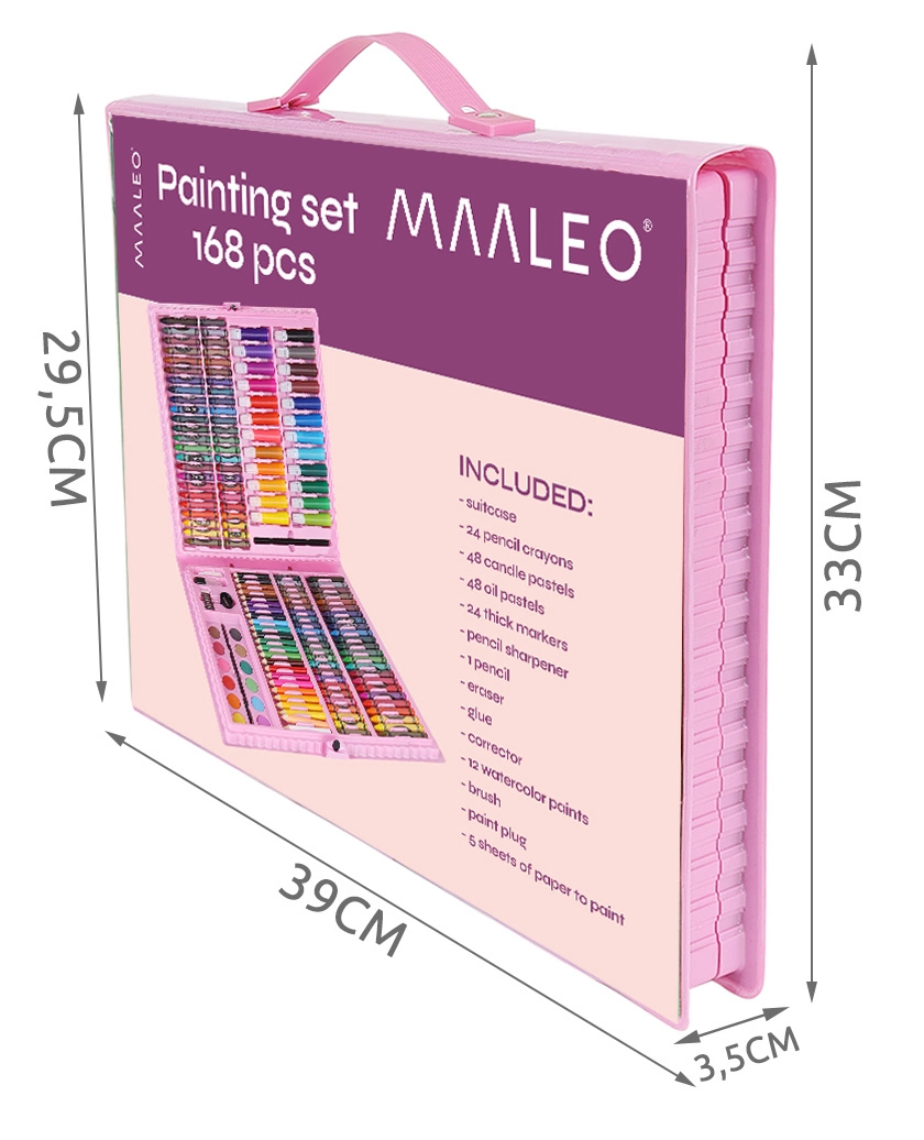 Duży zestaw do malowania i rysowania to wspaniała rzecz na początek artystycznej przygody dla hobbystów, jak również dla bardziej doświadczonych plastyków. Komplet jest funkcjonalny i składa się łącznie z 168 przydatnych części wraz z praktyczną walizką. Duża ilość elementów umożliwia praktyczne wykorzystanie i pozwoli realizować rozmaite, kreatywne pomysły. Przy pomocy ogromnego wyboru 24 kredek, 24 mazaków, 48 pasteli olejowych, 48 pasteli świecowych, 12 farb akwarelowych, temperówki, kleju, korektora, gumki do mazania, kartek a4 z łatwością stworzymy najbardziej wymyślne, kreatywne i oryginalne prace. Przybory mają szeroką oraz atrakcyjną gamę kolorystyczną.