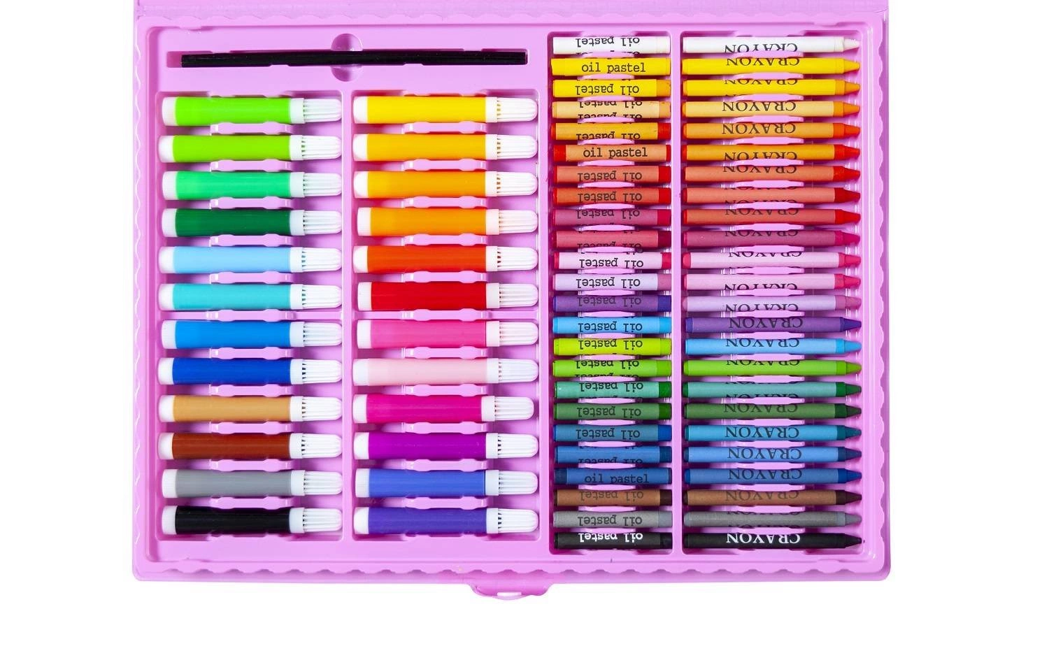 - 168 ELEMENTÓW – przy pomocy ogromnego wyboru 24 kredek, 24 mazaków, 48 pasteli olejowych, 48 pasteli świecowych, 12 farb akwarelowych, temperówki, kleju, ołówek, korektora, gumki do mazania, kartek a4 z łatwością stworzymy najbardziej wymyślne, kreatywne i oryginalne prace.