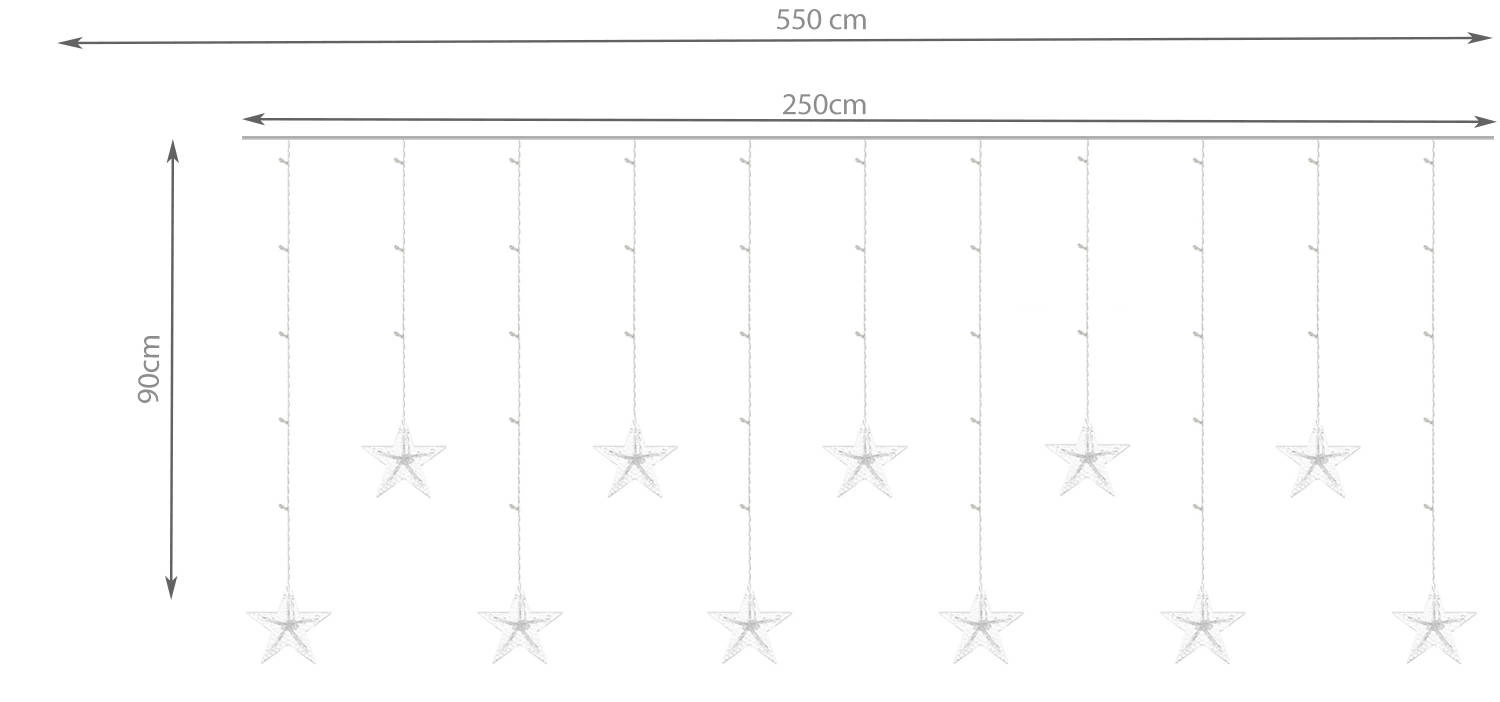 - SPECYFIKACJA – ilość trybów: 8; rodzaj oświetlenia; LED; barwa światła: zimny biały; kolor okablowania: przeźroczysty; ilość diod: 108; klasa wodoodporności: IP44; sterownik: tak; zasilanie: sieć energetyczna; moc: 3,6W; napięcie: 230V / 31V; długość całkowita: 550 cm; długość świecącej kurtyny: 250cm; długość sopla: 90 cm; waga: 0,42 kg; waga w opakowaniu: 0,48 kg.