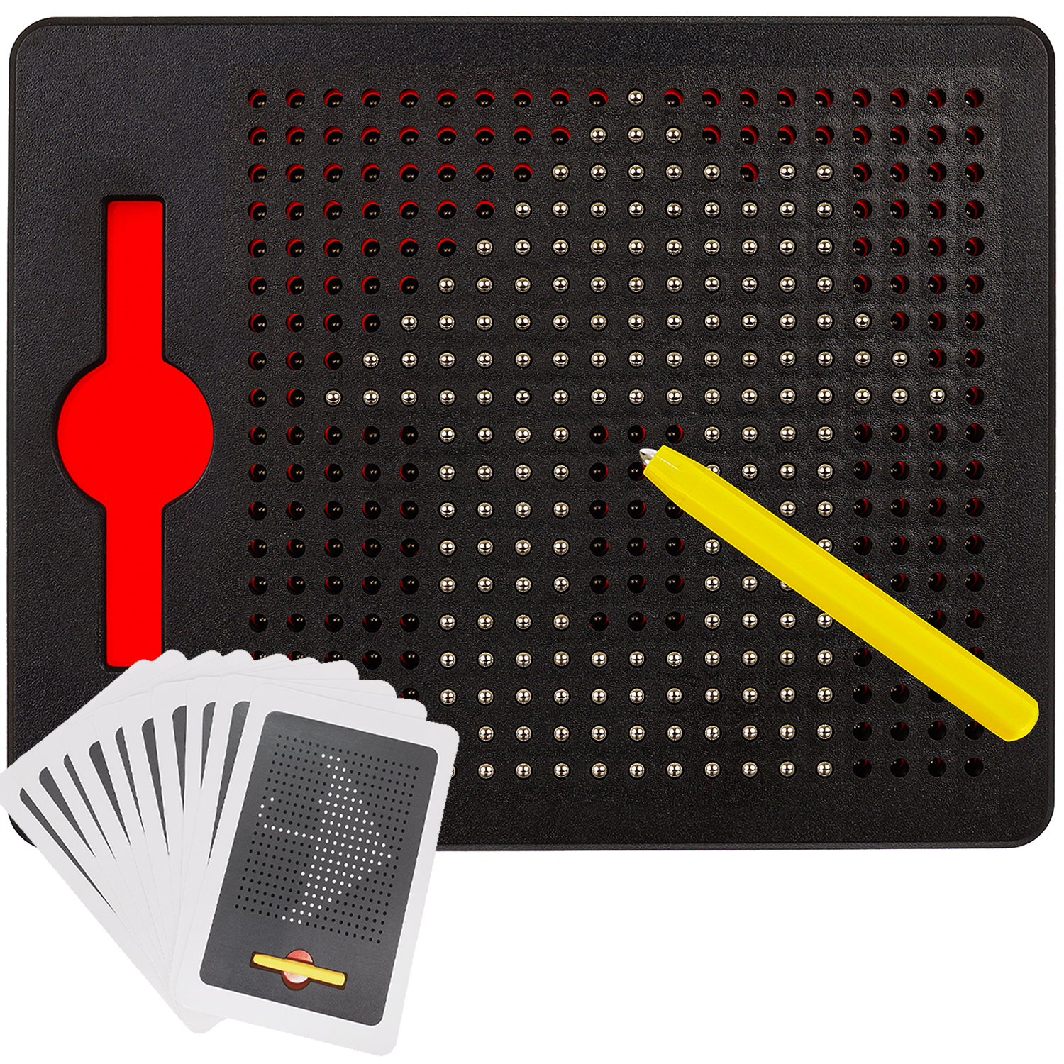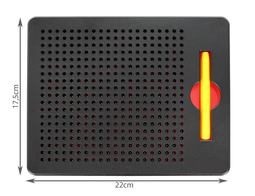 ✔️ 20 przykładowych wzorów – do zestawu dołączamy dwustronne kartoniki, na których dziecko znajdzie aż 20 przykładowych rysunków (serduszko, kotek, statek, domek, samochód itp.) oraz specjalny rysik z magnesem, który znajduje się w uchwycie z boku tablicy
