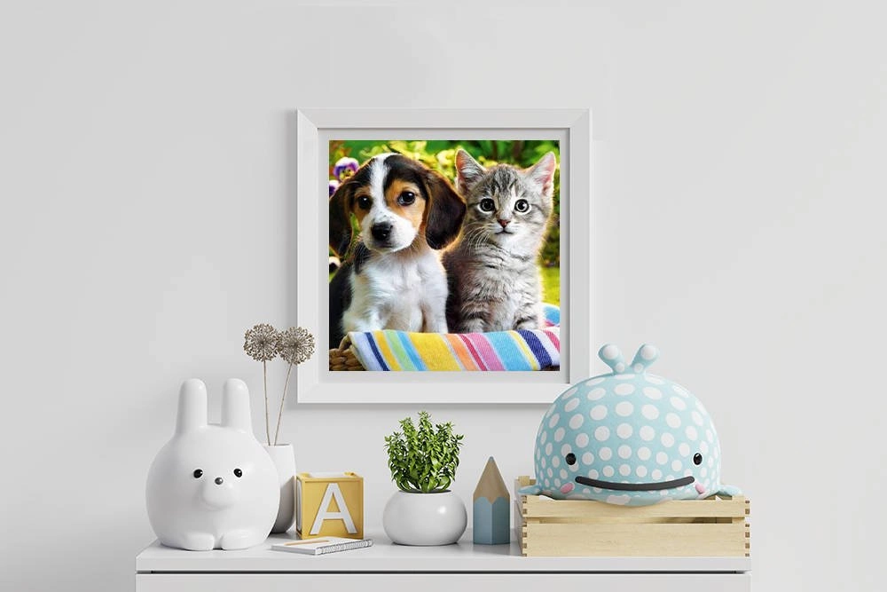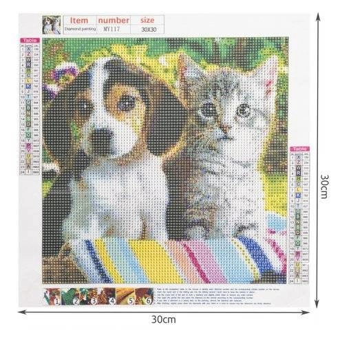 • SPECYFIKACJA – wzór pies i kot; wymiar: 30x30 cm; wymiar obrazka: 25x25cm; płótno pokryte warstwą klejącą: tak; w zestawie: kolorowe diamenciki, aplikator, suchy klej, pojemnik; waga: 0,1 kg; waga w opakowaniu: 0,103 kg