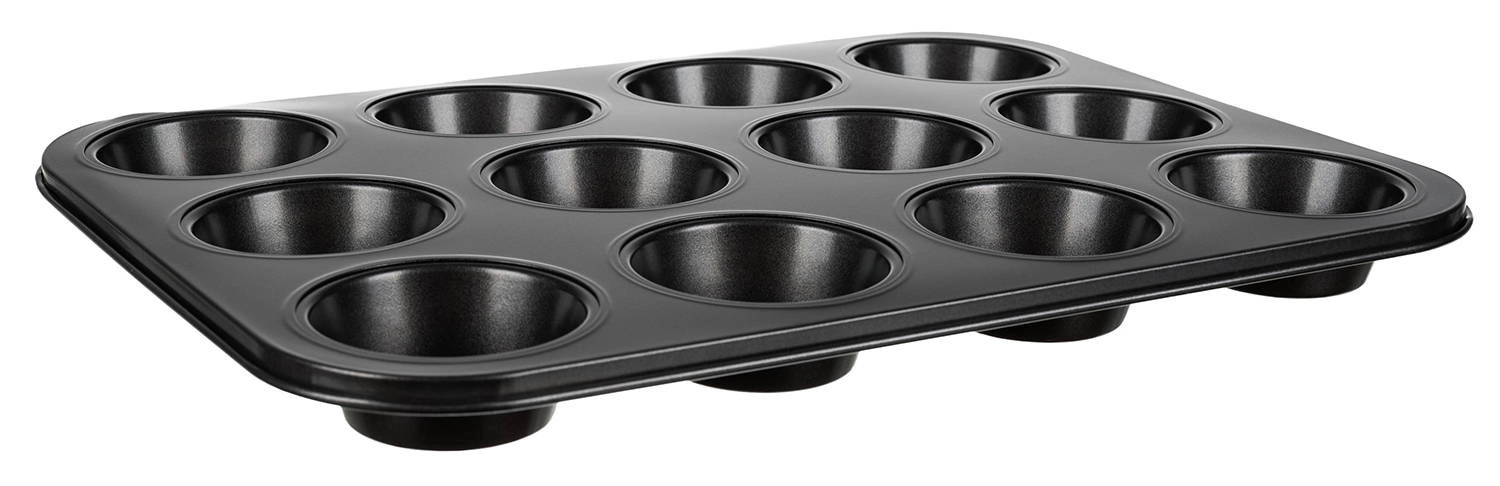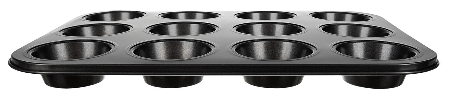 - 12 OTWORÓW – blaszka posiada 12 otworów przystosowanych do pieczenia babeczek. Materiał użyty do produkcji zapewnia równomierne nagrzewanie się naczynia, dzięki czemu ciasto jest dobrze wypieczone i kruche.