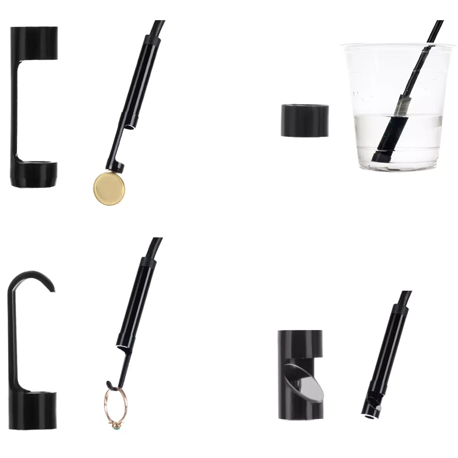 - 4 KOŃCÓWKI W ZESTAWIE – kamera posiada aż 4 wymienne końcówki. Każda z nich ma inną funkcję (końcówka klasyczna, hak, magnes, lusterko ). Kamera jest połączona z długim przewodem, który jest bardzo elastyczny i wytrzymały. W łatwy sposób możesz dotrzeć do nawet bardzo trudno dostępnych miejsc i zobaczyć, co jest przyczyną usterki.